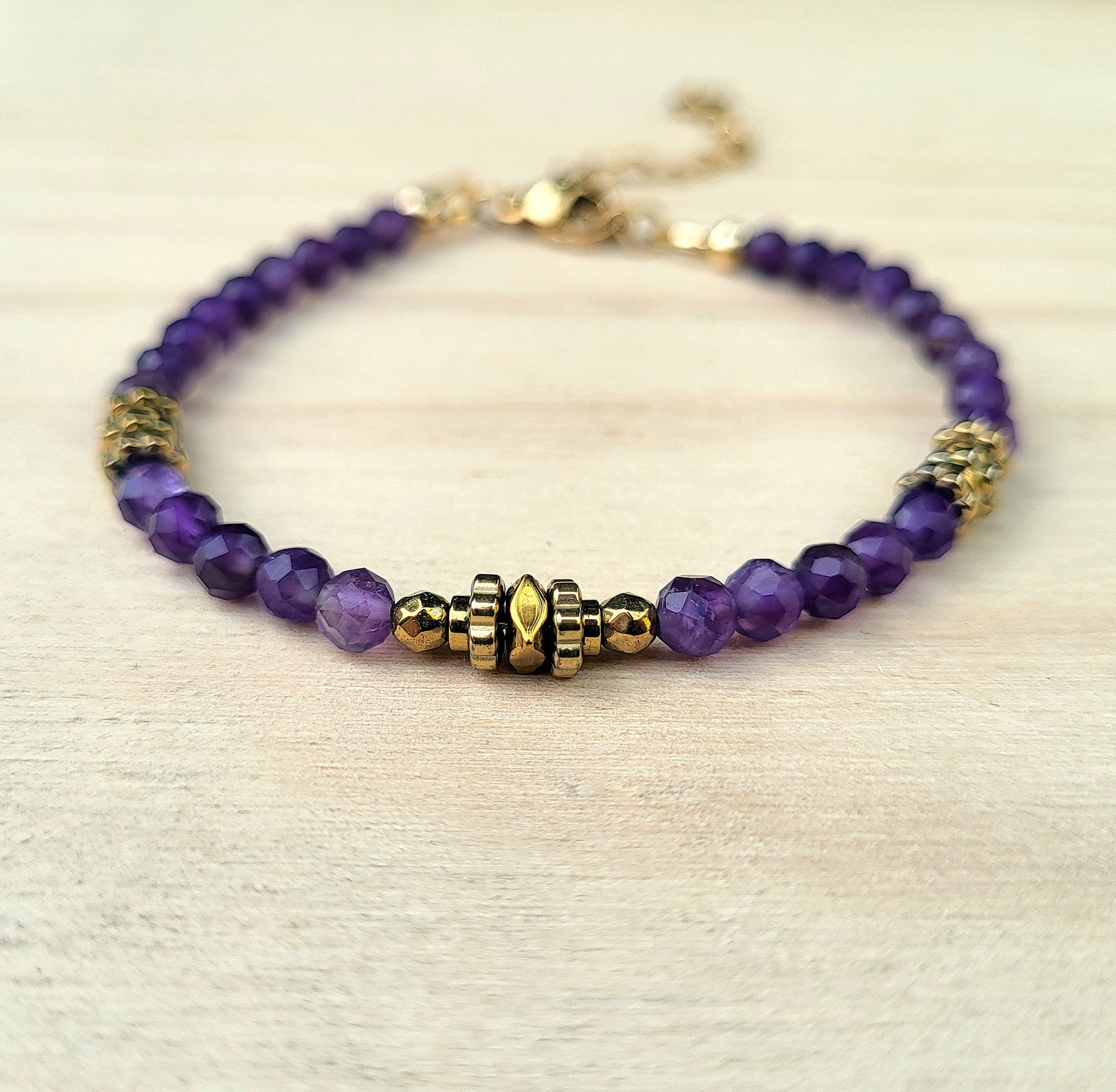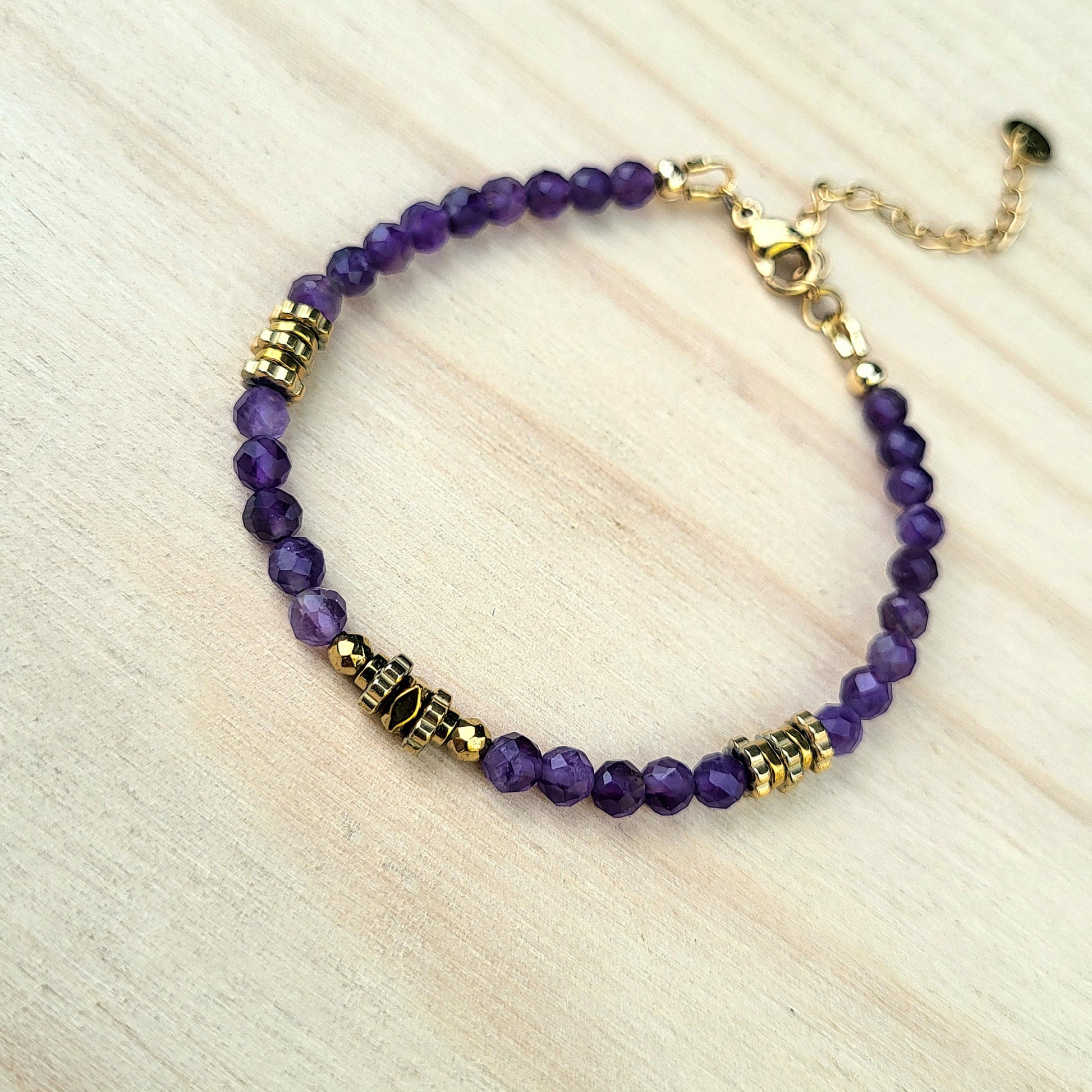 Bracelet pierre naturelle Amethyste – Bijou femme doré à l’or fin – Fermoir acier inoxydable – Cadeau énergétique lithothérapie